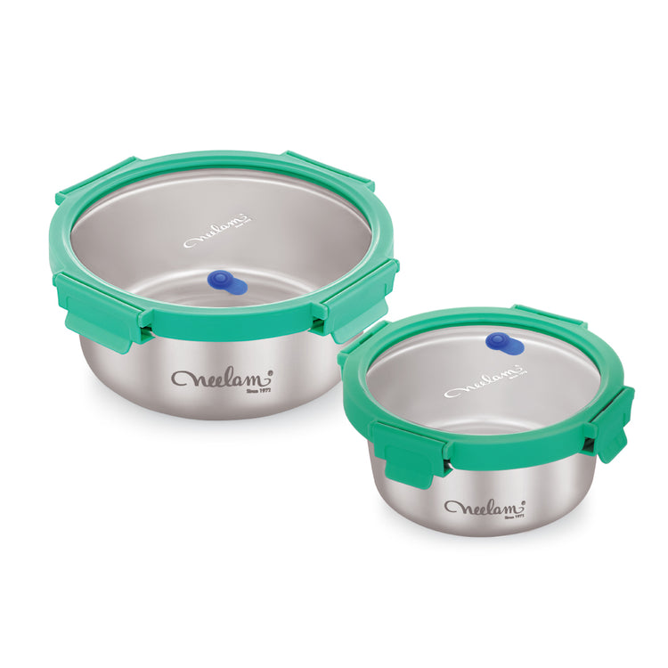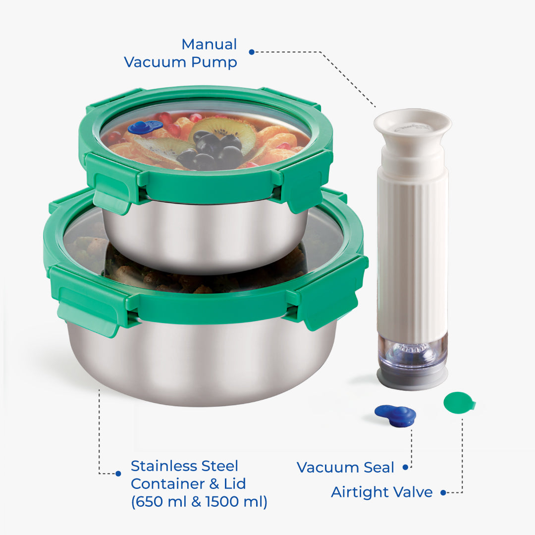 Perfect for everyday convenience and lasting freshness, the Round Duo Vacuum Container combo is designed to seal in goodness longer. This versatile set, featuring 650 ml and 1500 ml round containers, ensures every meal and cherished memory stays just as fresh. Crafted from durable stainless steel, featuring a clean and sleek finish, Round Duo is ideal for daily essentials, batch cooking, or generous portions.
